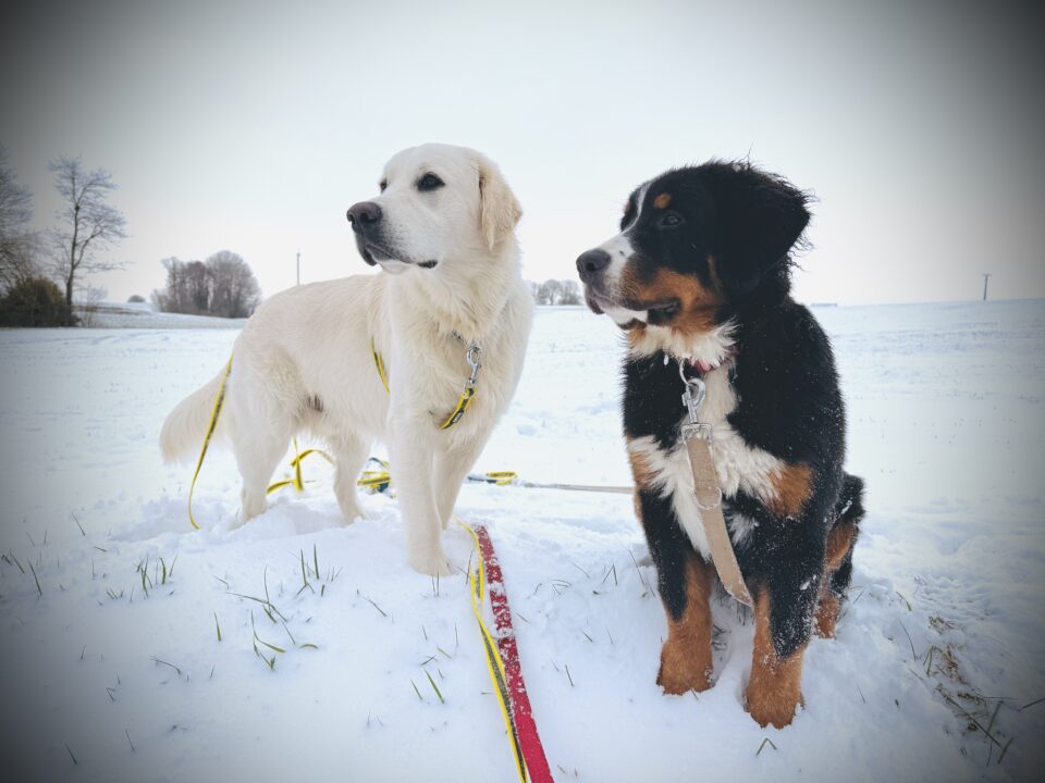 Dré (golden) is ondertussen 5,5 maand en heeft nu het gezelschap gekregen van Swa (Berner). Beide uit het Meerhof. Twee
