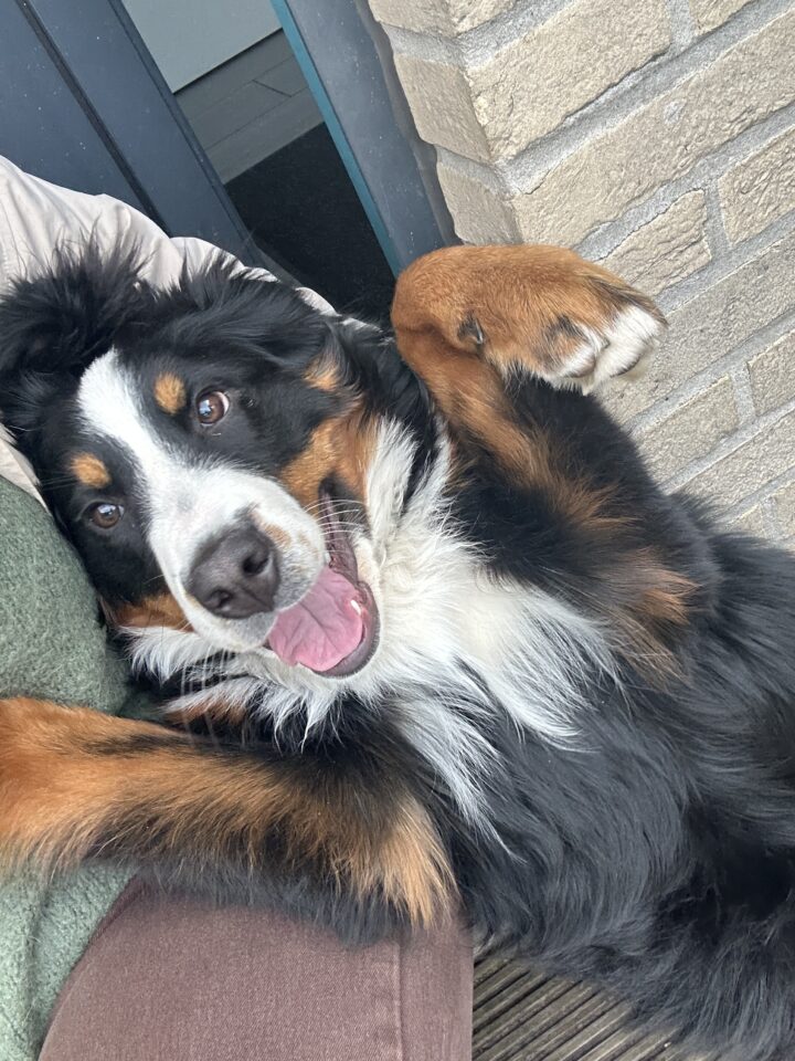 Zelf nooit kunnen inschatten dat je op korte tijd zo’n band krijgt met een hond. Hij hoort er helemaal bij, in de krokusvakantie ging hij al mee naar de Ardennen. Dat was zalig samen. Af en toe spreken we af met zijn zus Rani op de speelweide. Daar hebben heel veel deugd van. En de baasjes ook…